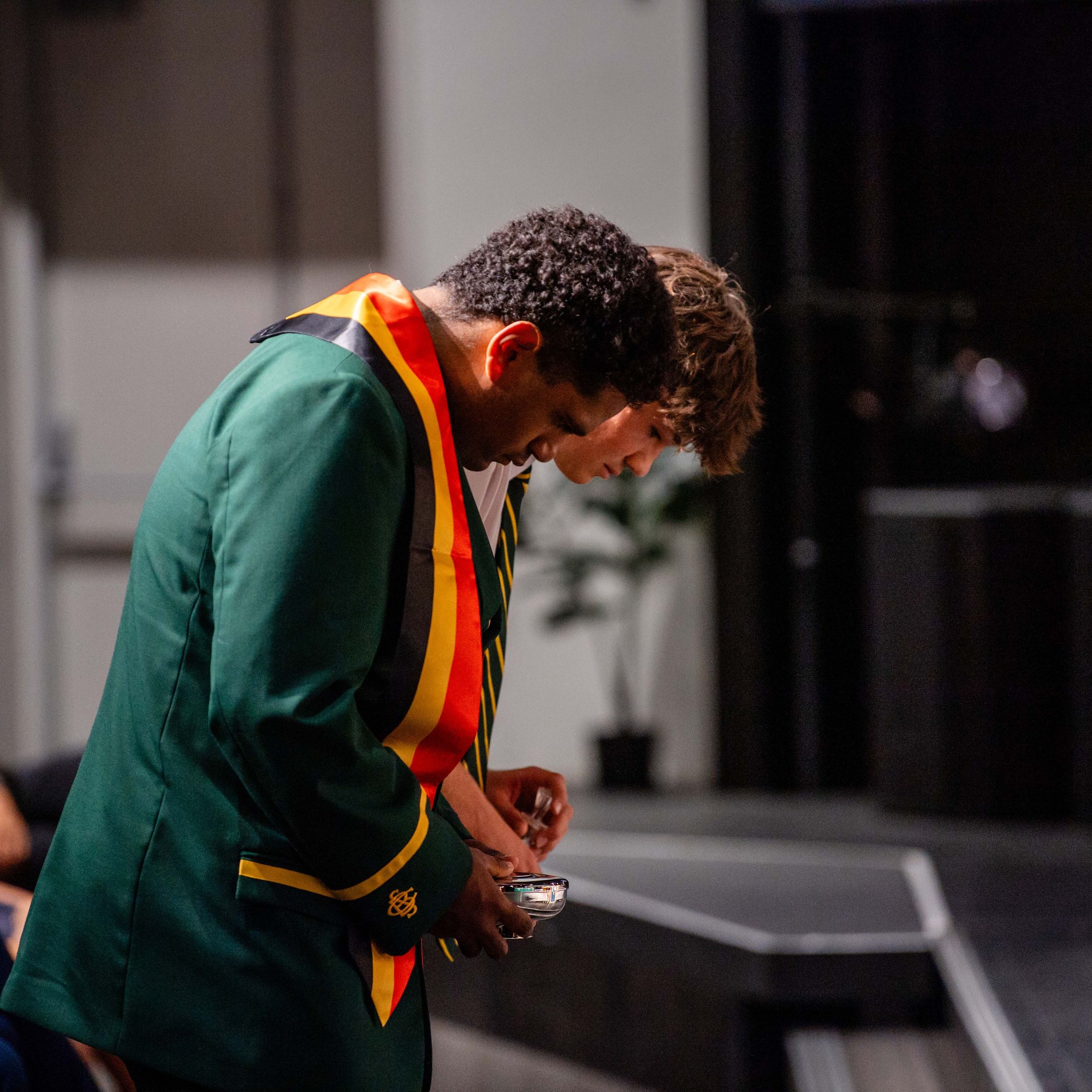 A significant moment followed with the formal leadership jacket handover between the 2025 and 2026 College Captains. Outgoing leaders Cameron Da Forno (College Captain), Matthew Bezuidehout (Vice Captain), and Jaxson Wyman (Boarding Captain) passed on their jackets to incoming leaders Cooper Witts (College Captain), Thomas Brown (Vice Captain), and Louis Maxwell (Boarding Captain). The exchange was rich in tradition and meaning, marking the continuity of leadership at the College.